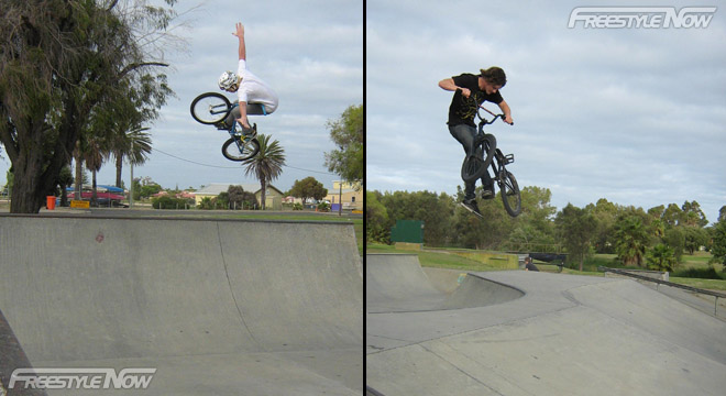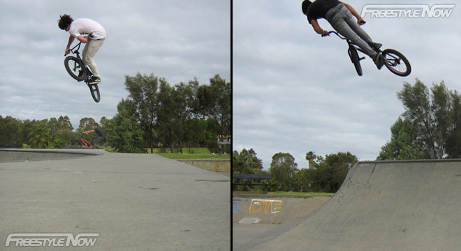 Clock wise from top left – Jackson Banfield pole jamming to fakie, Dylan Schmidt grabbin, Darren Piper flips it to fakie, Ben McManara get pickin