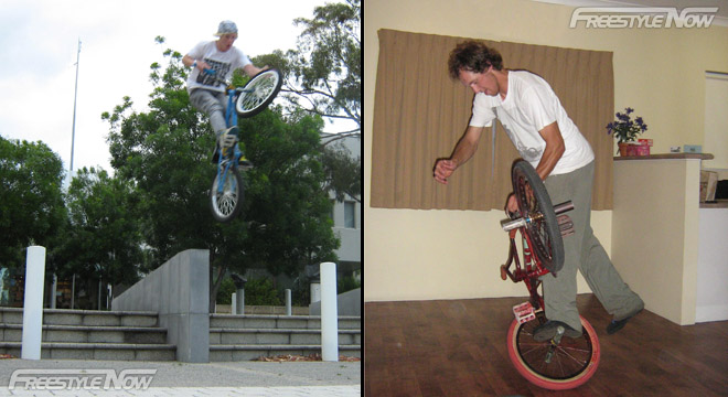 Ben Moran pumps his bicycle in circles without the use of one hand and one foot