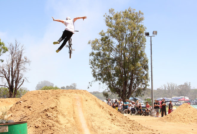 The recent bmx dirt competition that took place at Narrogin RevHeads on the 19th of November saw some gnarly riding go down. The dirt competition was part of the Narrogin RevHeads event, full of cars big and loud, FMX competition, burn out comps and bikini babes. The bmx dirt jumps were put together by Daniel Christianson over a week, that dude need to be given mad props for smashing the jumps together in the way he did. Unfortunately for DC he came a gutsa in a big way and took a compound fracture to his finger, not a pretty sight but like a true champion he is he went to hospital and came back again to watch. With the comp under way to the smell of burnt rubber riders hit the jumps and smashed out some radness. When the dust and rubber smoke had cleared it was Lewis Nolan who took the win. Scope out some of the photos and go build some dirt jumps of your own in preparation for 2012 Revheads.