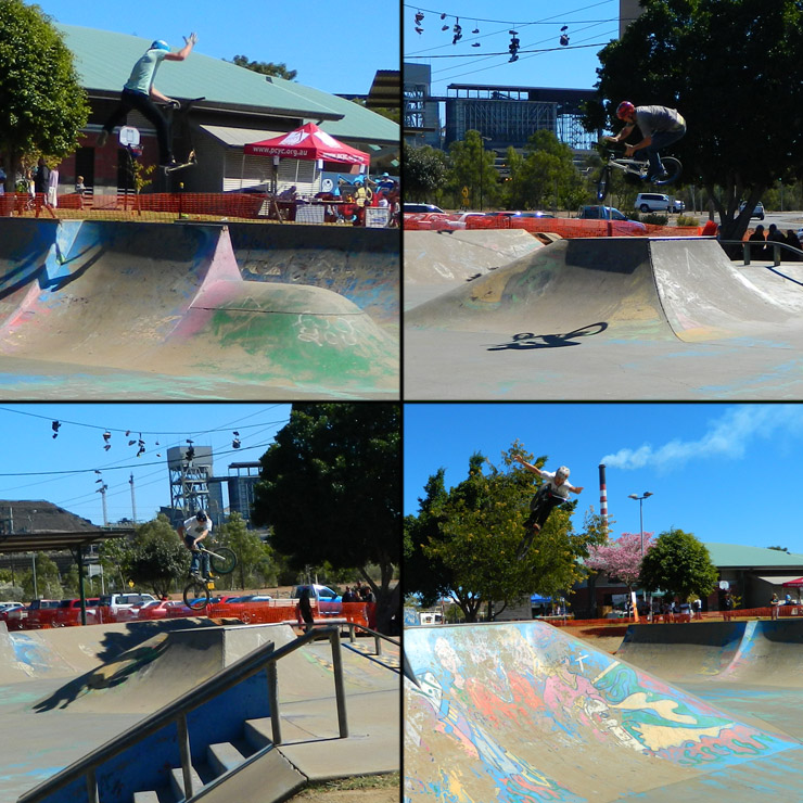 Clockwise from top left – Ricky Peel entered both scooter and bmx but a snapped chain held him back in the bmx comp, he still threw down a rad opposite one and one footer over the spine in the scooter rounds – Kevin Moore is a new Mount Isa transplant and ripped the heck outta the skatepark, barspin allyoop 270 – Kyle Coleman smashed this hip both ways and did tuck no handers as well – Harley Steed has been ripping the Mount Isa skatepark for a few years now, turndown over the box.