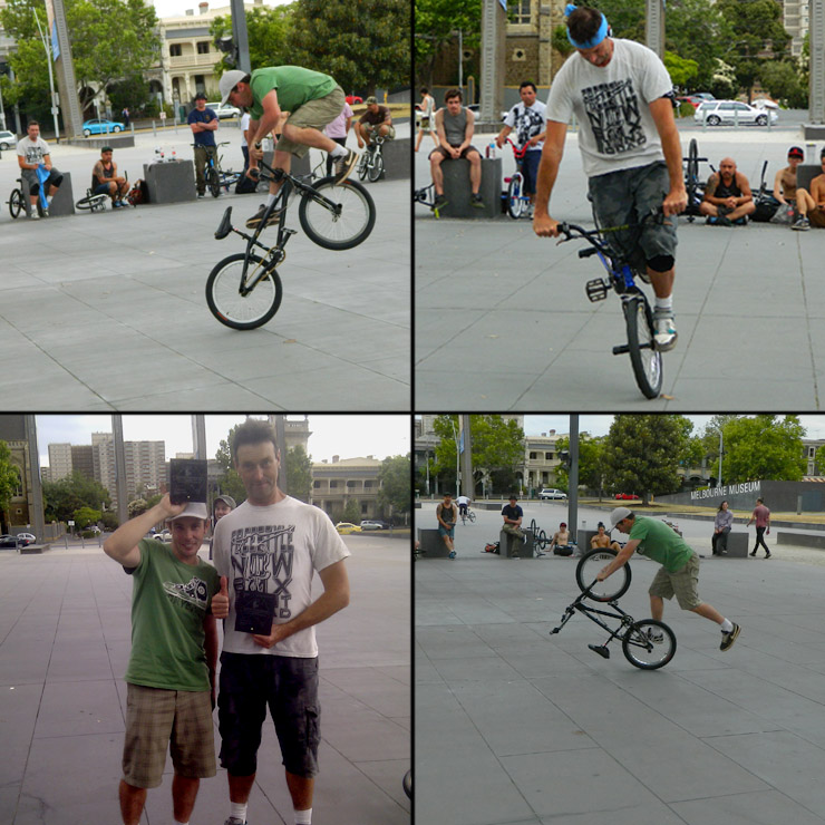 The last round of the 2012 series of the DownUnderGround, national flatland contest series was recently held in Melbourne. Freestyle now squad members Jason Parker and Shaun Jarvis attended to ride and enjoy all the things that make riding bmx fun. The contest was fairly low key but with a good turnout of riders the day made it a great contest. Jason took out the win in the advanced class with Shaun taking the second placing. It is good to see that even though Shaun founded Freestyle Now 26 years ago and Jason joined the Freestyle Now squad in 1999 but both of these riders are still out there and competing and riding hard. Congratulations to both of these squad members on their placing.
