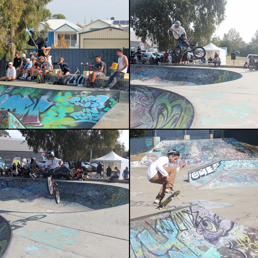 Clockwise from top left – Jakob Wells took ut the win in the scooter open class at Rockingham, it was a very close competition with only a few points between 1st and 5th – Luke Tooze getting in a lookback transfer at the nearly 20 year old Rockingham skatepark on his way to 1st place in BMX open – Java Ru skated well and put his skills out there for others to see and skated well – Taj Hamilton is a rad kid who is always pumped to rip it up, big flying W at Rockingham for the win in the beginners. More photos can be found on the facebook page here.