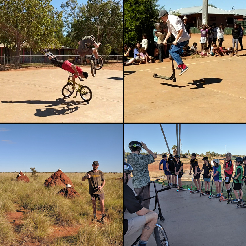 Clockwise from left – Josh bunnyhops over Shaun at the school at the Warralong community – Karee whipping it up on the flat at the Warralong community – The skatepark coaching session at Port Hedland was well attended – Some of the termite mounts have started wearing hard hat due to the occupational health and safety regulation that has been imposed on them. More photos can be found on our facebook page here.