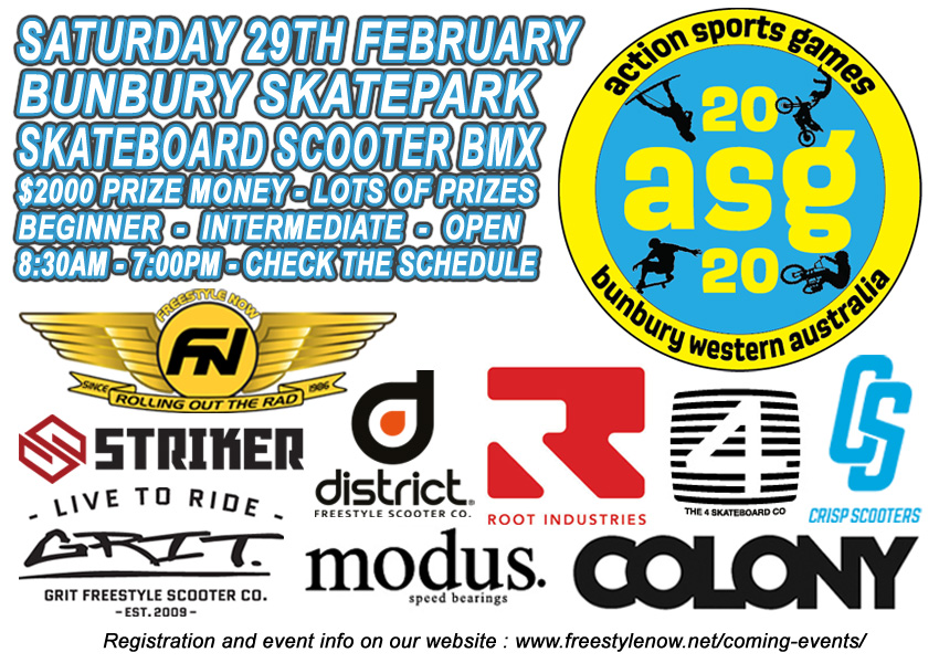 Freestyle Now head judge and competition announcer Shaun Jarvis “The Bunbury Action Sports games is such a rad competition. So much radenss takes place. Last year was epic, like the 3 way tie in scooter open. It’s such a hard competition to judge as the riding is so diverse and on an insane level. We are looking forward to rolling out the rad once again in Bunbury. Freestyle Now has been managing the Action Sport Games skatepark competitions since they started back in 2011. If your not in Bunbury to compete or to watch then you’re missing out on history in the making.”