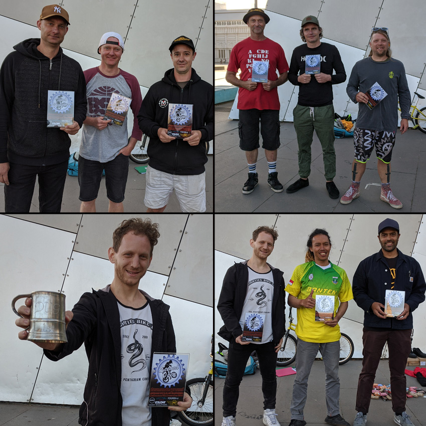 Clockwise from top left – Top 3 in beginners – Top 3 in experts – Top 3 in open – The 2019 Australian bmx flatland champion Gonzalo Bellanti.