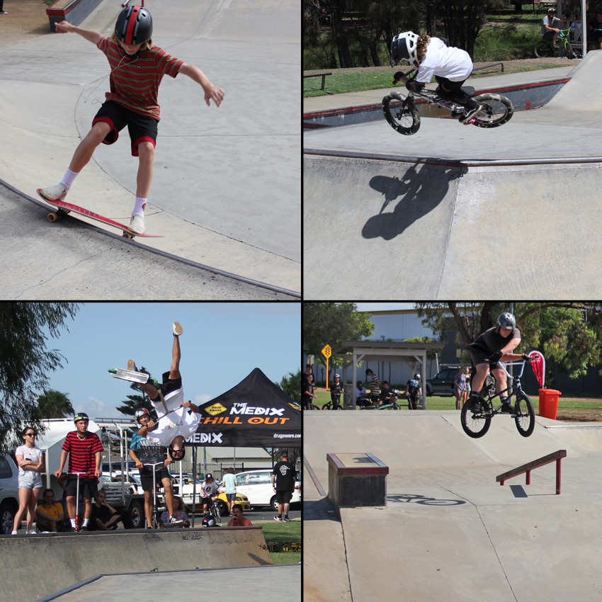 Clockwise from top left – Levi Pound slashing to first in skate intermediate – Albie Livesley is a future BMX pro, definitely progressing and going bigger – It would not be a Bunbury Action Sports games without Rowan Cosh doing an X up – So stoked to see Tyson Carroll still hitting it up and getting rad on the scooter with a 2nd place in scooter open. More photos can be found on our facebook page here