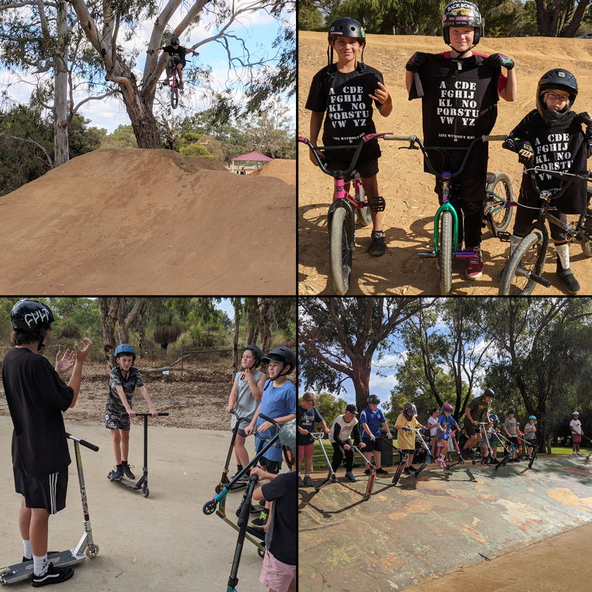 Clockwize from top left – The Guildford bmx jumps engagement session was a great fun time. Freestyle Now hosted a coaching jam session thanks to the City of Swan. Ronan is a rad young rider and hit up this no hander during a best trick challenge. – The participants at the Guildford bmx jumps coaching jam session had a fun time. Freestyle Now made up a challenge that had teams of three riders. Each team had to include three different levels of riders, super confident, medium level of confidence to gaining confidence. The teams had to make up a run over the jumps and whichever team that the best looking run (having the three riders jumping over the jumps) would win. On this occasion it was the “eye don’t care” team won on a runoff against the “biker dudes” (each team had to come up with a name). Ronan, Campbell and Magnum all won a Freestyle Now “Life without BMX” t shirt. – The Altone skatepark coaching session had lots of participants. Here Luke Tooze who rides bmx is helping scooter riders learn some basic confidence building skills. Jumping into a ramp and landing on the scooter deck with both feet in the right position. Freestyle Now coaches are multi talented and skilled and have the ability to cross over into any discipline. – Kareece Furneyvall engaging with scooter participants at one of the skatepark activation sessions.