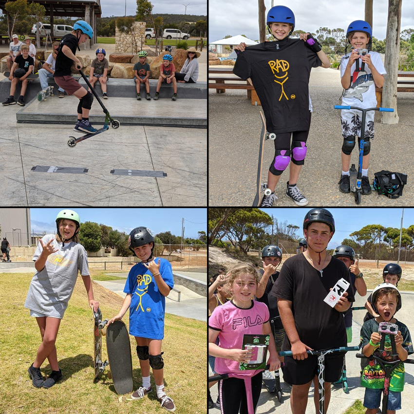 Clockwize from top left – The Bremer Bay skatepark engagement sessions were super rad, with lots of participants. One of the challenges we held is a long bunny hop jump. In most cases we put a restriction on the run up so the participants don’t have a lot of speed. This adds a level of difficulty as the slower you go the less of a distance you can jump. This also adds a safety feature into the challenge. We all know the faster you go the harder you fall. – Winners are grinners at Bremer Bay. – The skatepark activation session we held in Hopetoun had many participants. The sessions were staged over two day, one on the afternoon and one in the morning. In the afternoon session we were inundated with participants, most were beginners on scooters. Freestyle now squad member and head coach Shaun Jarvis ended up taking a group of 20 participants and teaching all the basic scooter skills so that they had more confidence when transversing the skatepark. The next day in the morning we held a coaching jam session and gave away some prizes. As you can tell by the skatepark users were stoked. – Skateboarding has a good following in Hopetoun and there were more girls on skateboard than boys. These two girls won a Freestyle Now t shirt each from the different challenges we had set for them to participate in.