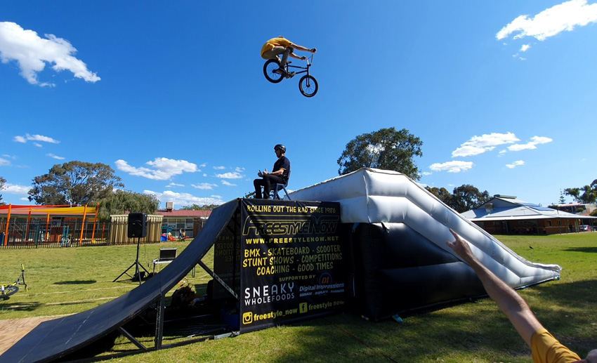 Freestyle Now attended the Embelton primary school for a school assembly presentation as part of a reading reward program they had running at the school. The day before the school assembly presentation Freestyle Now hosted a coaching session at the school for skateboard, scooter and bmx participants. In the presentation we spoke about how putting in the effort you are able to achieve the rewards and bmx riding is just one example of this. You cannot get good at bmx freestyle riding if you don’t put in the effort. The more effort the bigger the reward. Main Freestyle Now presenter Shaun Jarvis also spoke about the act of kindness and that how being kind has its own reward, others being kind to you. Freestyle Now squad member Luke Tooze was on hand to throw down some of his radness as well as good friend Daniel Davis. The school students love it and got super excited when Principle Walker sat on top of the ramp and got jumped over.