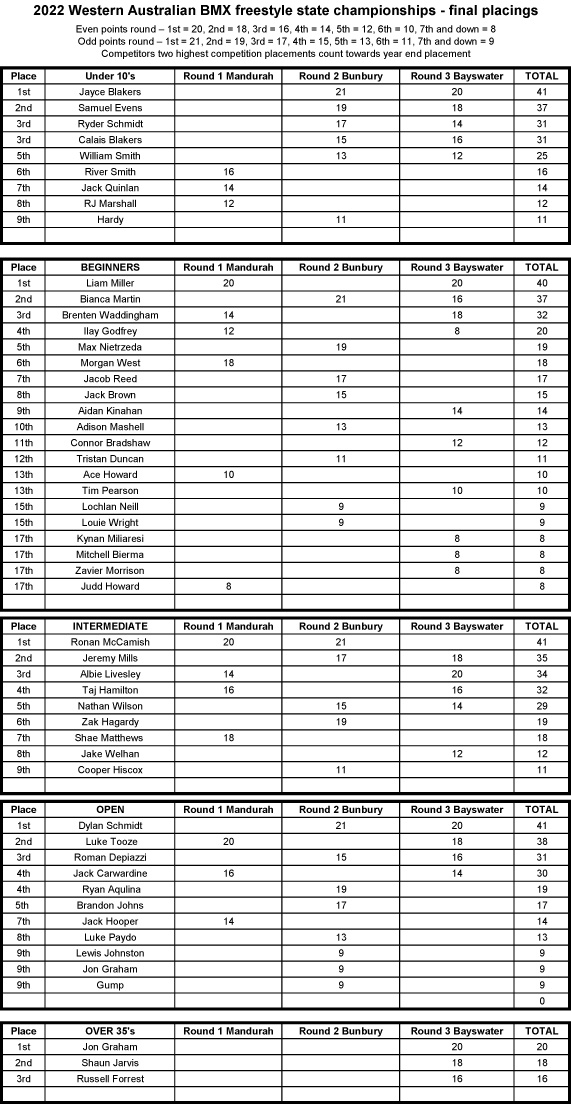2022 Western Australian BMX freestyle state championships 18th December – official results