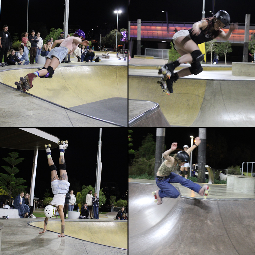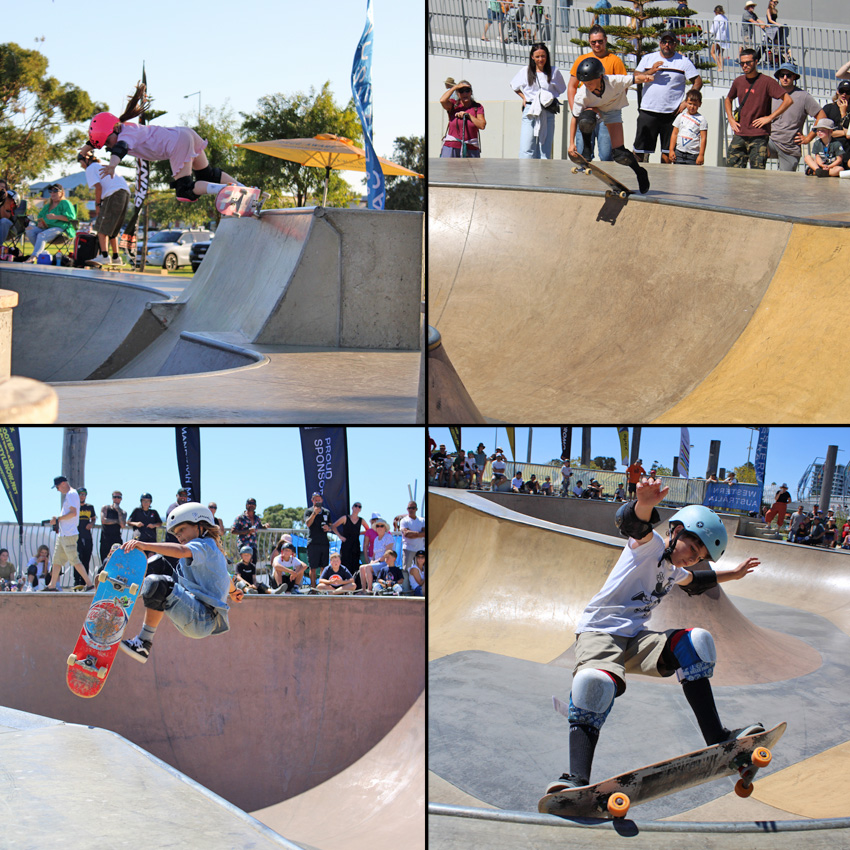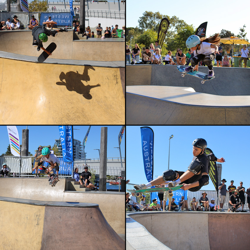 Clockwise from top left – Cruz Evans is a skateboarding machine, so much power and skill, 1st in opens mens and $500 richer. – Mia Kretzer has now got back to back wins in open womans at Action Sports Games in the past two years. – Adam Pacynko took a hiatus from the west oz skate scene and headed to England for a couple of years but he is back and rippin it. 2nd place in open mens in. – Hailee Roberts shreds hard and took home $300 and a 2nd place.
