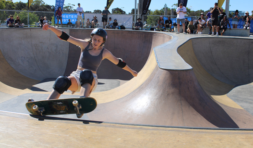 Emily Palmer brought their stoke to the Mandurah Action Sports Games had some rad front side grinds.
