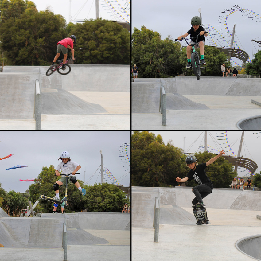 Clockwise from top left – Austin Bailey hitting a huge air over the hip – Oscar Kerin going hard with an air up the bank – Jordan Thomas skating up the bank into an olly – Brayden Marley whipping over the rail. – Find more photos on our facebook page here.
