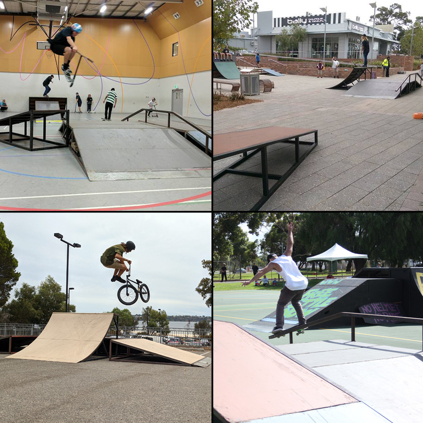 Pop up skatepark coaching sessions. These sessions can be hosted in many different locations. Clockwise from top left – indoors, community spaces, basketball courts and carparks