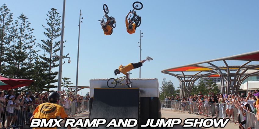 The Freestyle Now BMX ramp and jump stunt show consists of BMX ramp and jumping stunts. This show has 4 professional BMX performers that perform a variety of mid air BMX stunts over a jump. Back flips, front flips, 360’s and no hander’s are just some of the crazy tricks the riders perform. The BMX performers do singular, double and triple routines throughout the show performance. The Freestyle Now BMX ramp and jump stunt show is 10 minutes in duration but can be adapted to suit your event if required. The ramp and jump stunt show can easily be set up in full set up on any flat level surface including pavement, grass, dirt and gravel with an approximate area of 60 meters x 10 meters with the opportunity to discuss smaller sizes if needed. Show set up and pack up time is approximately 1 ½ hours each. With the prior organization, quicker set up times can be arranged to allow for a quick in and out at different venues and shows. All required infrastructure is supplied by Freestyle Now, ramps, crowd control bunting, PA system, power cords (generator if required). This style of show is great for larger areas, such as showgrounds, ovals and indoor venues. The show has been very well received at agricultural shows, festivals, fairs and even half time basket ball entertainment. Please contact Freestyle Now if you require more information.